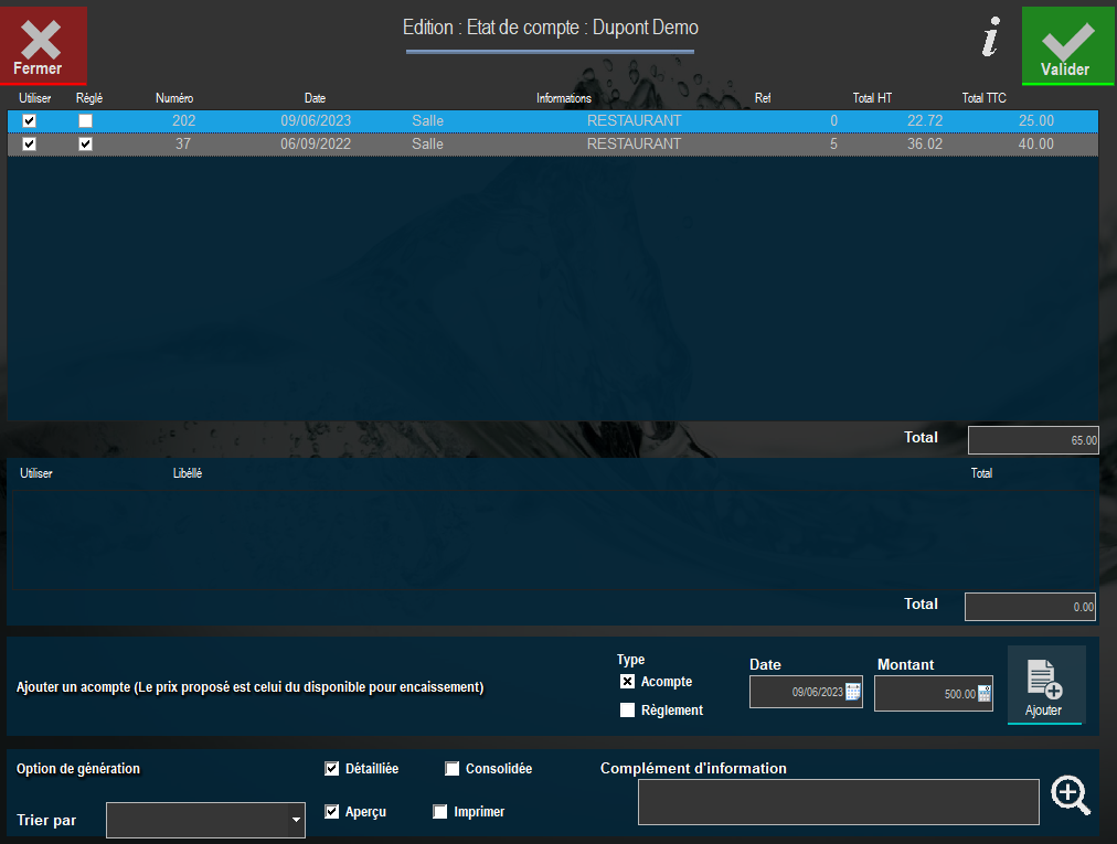 Lorsque vous choisissez "détaillé", la facture sera imprimée avec le contenu (articles et quantités) de chaque ticket.